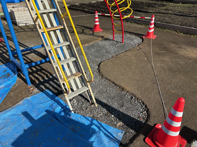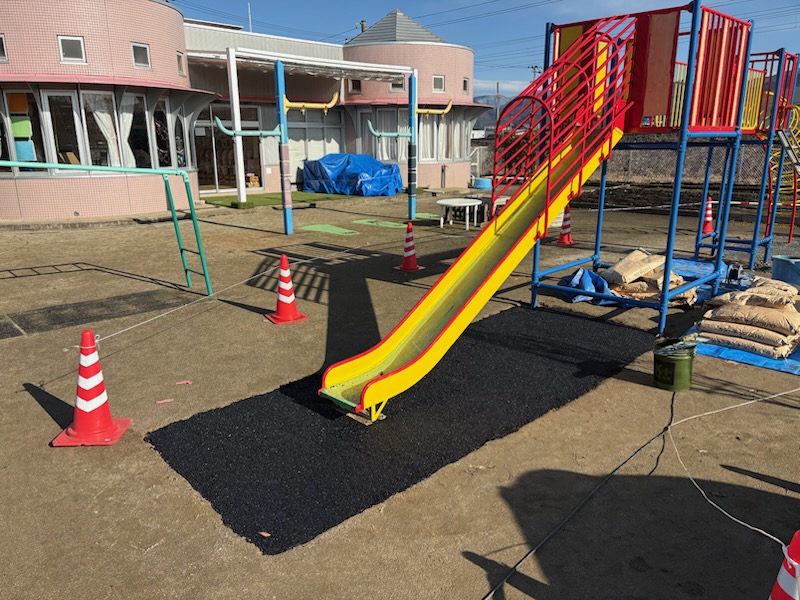 東北文教大学付属幼稚園 さま 鉄製遊具下にケガ防止のゴムチップ(50mm)を施工します。